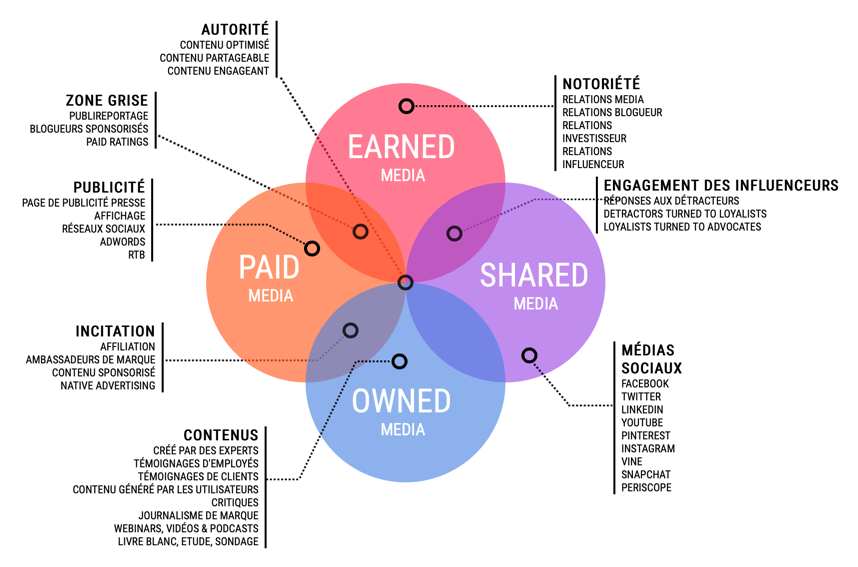 (généralement pour les stratégie d’outbound marketing) - Earned : contenu influencé, comme les relations presse online ou avec des blogueurs permettant d’avoir des contenus valorisant ses produits ou services.